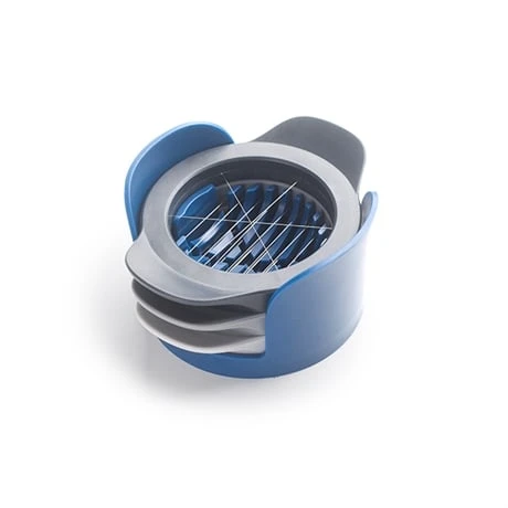 En plastique et acier inoxydable, cet ustensile bleu et gris prend peu de place dans vos placards car les trancheurs s’empilent les uns sur les autres dans le réceptacle.