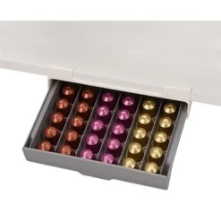 Ce tiroir de 7,5 cm de hauteur s’incline lorsque vous l’ouvrez pour vous permettre de saisir facilement la capsule de votre choix. Il se compose de 6 rangées dans lesquelles vous pouvez placer jusqu’à 5 capsules de 3,7 x 3 cm.