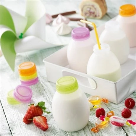 Ils sont faciles à secouer pour obtenir une consistance onctueuse de yaourt à boire. Les bouchons empilables se rangent près de la yaourtière. Les différents coloris sont très pratiques pour différencier les différents parfums.