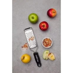 Après avoir révolutionné le domaine des râpes et zesteurs en intégrant un outil de menuiserie dans le monde culinaire, Microplane part de son modèle Premium Classic qui a séduit les cuisines des plus grands chefs pour les spécialiser dans des champs de compétences spécifiques. La râpe à fromage double tranchant Gourmet noir Microplane est faite d’une lame en acier inoxydable, découpée par photochimie pour une partie en un seul bloc bien plus résistante à l’usure, avec un tranchant dans les deux sens. Vous pourrez augmenter la vitesse de râpe grâce à cette fonctionnalité, et ses trous élargis sont faits pour un résultat en ruban : copeaux de parmesan, carottes, courgettes, patates, chocolat, la lame est taillée de manière à éviter de déchiqueter ou écraser les aliments pour un résultat optimal.