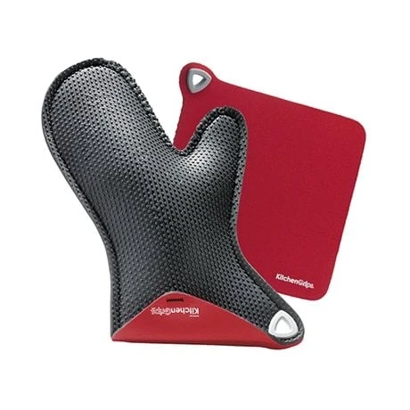 Cet ensemble gant et manique anti-chaleur Kitchengrips protège les mains des plats chauds et froids de -92°C à +260°C.